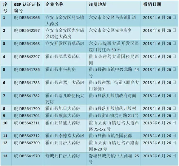 29日,安徽六安食品药品监督管理局发布相关通告称,药品经营企业应当按照国家有关规定配备执业药师,负责处方审核,指导合理用药,而13家企业原执业药师已注销,截至2018年6月26日,13家企业未聘用新的执业药师,不再满足药品经营条件要求。因此,按照有关规定,撤销13家企业GSP证书。