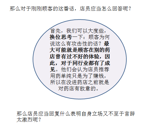 相信店员在日常工作中经常会遇到些“奇葩顾客”,要么絮絮叨叨又不买药,要么把店员当撒气桶拿来出气。相信不少店员都遇到过这种顾客,自己好心为其推荐用药,却遭到顾客的质疑,“行了行了,我自己看看吧,你们是医生吗,就推荐这些药……”听得店员是又气又委屈。作为销售人,难免要受些委屈,那么对于刚刚顾客的这番话,店员应当怎么回答呢?