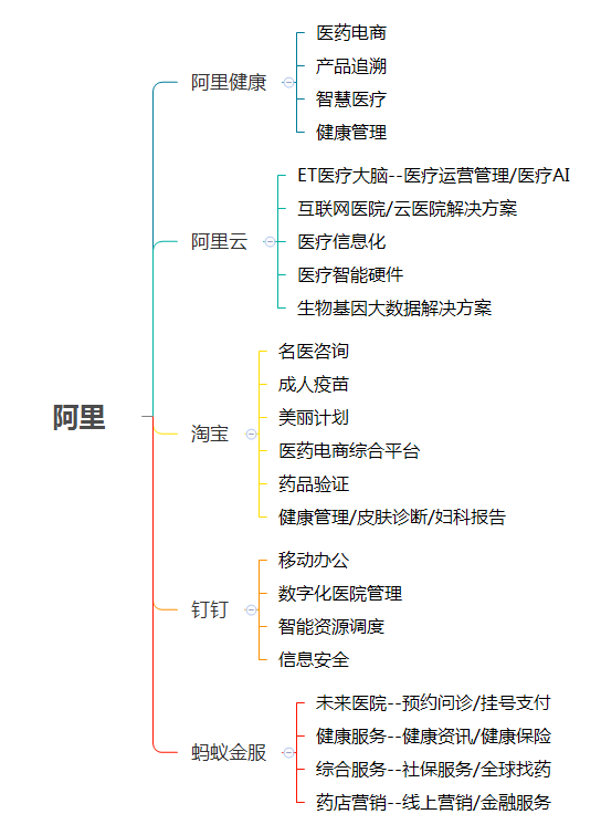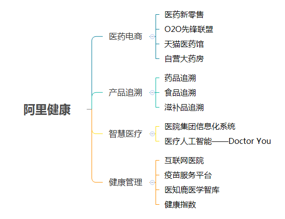 就阿里当前业务格局来看,其主要形成医药电商、产品追溯、智慧医疗、健康管理四条业务线。每条主线下又细分为不同板块。