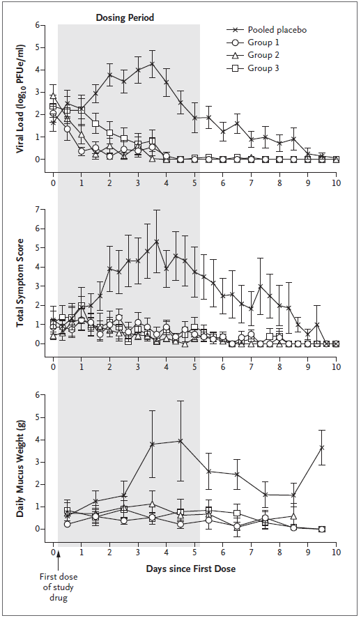 研究结果发现,与安慰剂相比,接受ALS-008176治疗的研究对象其病毒载量显著降低、病毒的清除率明显更快。此外,PCR分析显示,在安慰剂组病毒载量达到峰值时,接受ALS-008176的三个治疗组的平均病毒载量、AUC症状评分以及呼吸道分泌物总量显著降低于安慰剂组。其抗病毒活性在两个负荷量较大的组中RSV的清除速度最快,清除率最大,且病毒载量较安慰剂组下降了85%~88%。研究并未出现严重的不良反应,也没有必要过早停止研究药物。