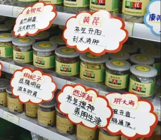 罐装中药饮片的陈列,药店选择用爆炸签将每味饮片的功效用八个字高度概括,这便省去了员工一一介绍的功夫,让消费者对产品功效一目了然,即便有疑问也可以有针对性地向店员咨询。除此之外,还能帮助员工对该产品的卖点与关联用药推荐方式进行记忆。