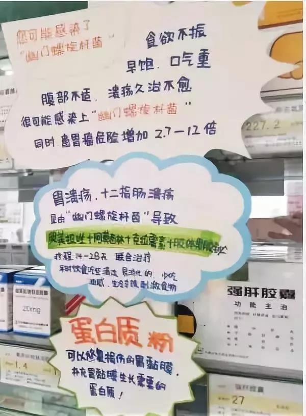 药店在胃肠药专柜做的这组爆炸签陈列,讲解了感染幽门螺旋杆菌的症状及导致的疾病——胃溃疡、十二指肠溃疡等,推荐了一组“奥美拉唑+阿莫西林+克拉霉素+胶体果胶铋”的联合用药及注意事项,最后还向消费者宣传了蛋白质粉的功效。