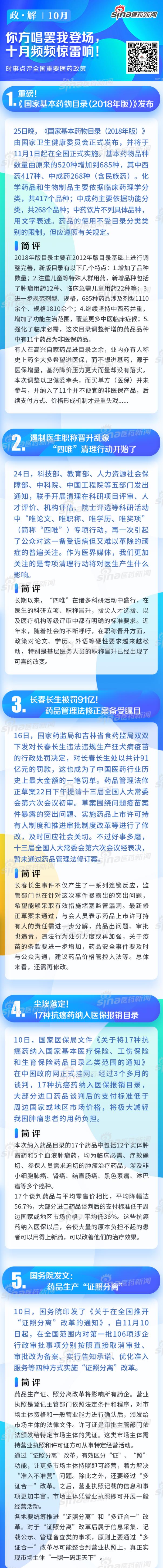2018新版基药目录出炉,新增165种药物品种,诸多药企小伙伴们在高兴自家药品纳入目录;卫计委的时代要过去了,多省纷纷组建卫健委、医保局,全国也将进入三保合一时代;长春长生被罚91亿成中国医药行业历史最大罚单,随之而来的是药品管理法的修正案备受瞩目;历经3个多月的谈判,17种抗癌药纳入医保报销目录;国务院推行药品证照分离改革;医生职称晋升乱象清理;又一省明确未过一致性评价不采购......