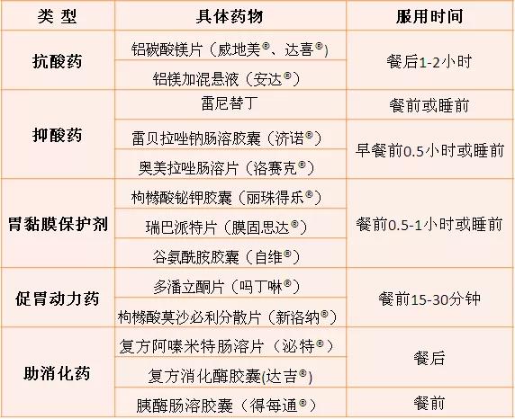 常用药物有复方氢氧化铝片(胃舒平®)、铝碳酸镁片(威地美®、达喜®)、铝镁加混悬液(安达®)等。抗酸药在胃内没有食物时能更好的分布于胃肠道表面,发挥保护作用,所以患者应在胃内食物最少时嚼烂服用(即餐前1小时或进餐后1-2小时),一般药效可维持3-4小时。但如果餐后立即服用,药效只能维持1小时左右。