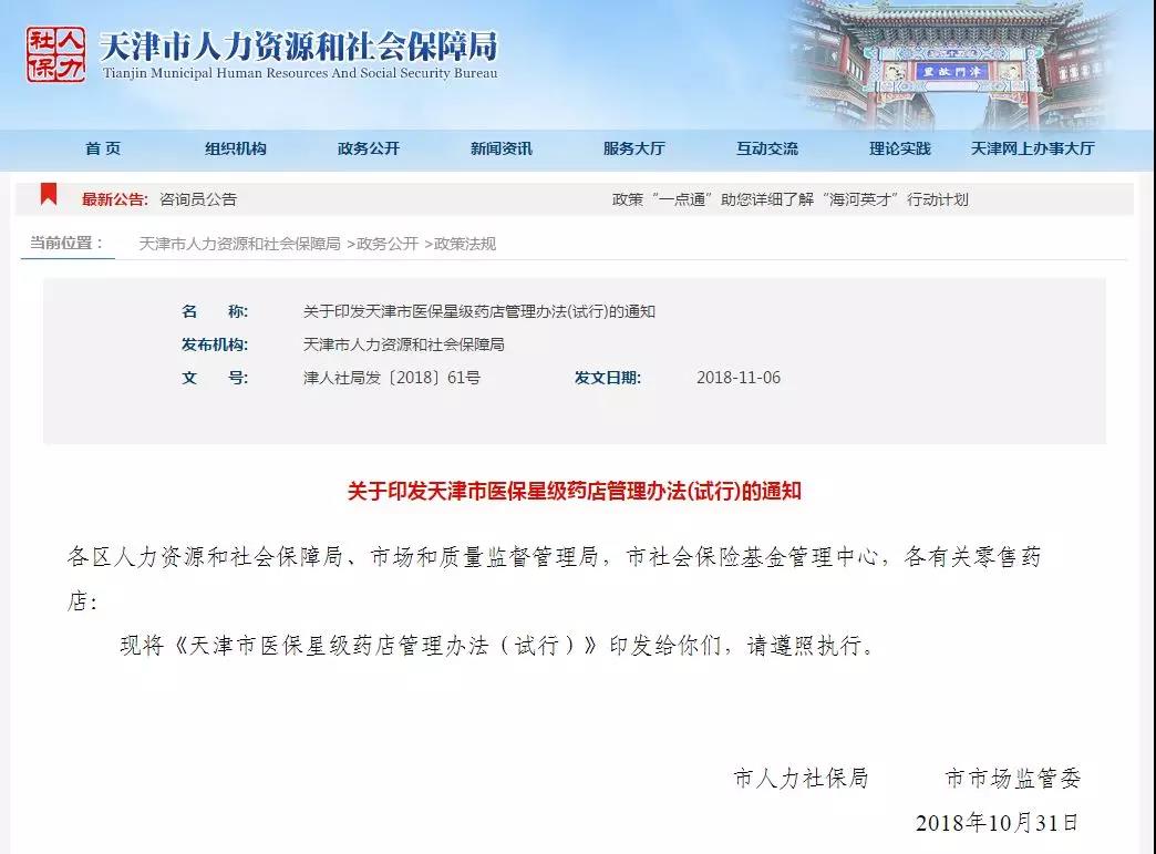 日前,市人力社保局、市市场监管委制定并发布《天津市医保星级药店管理办法(试行)》,以保障患者多渠道购药和享受优质服务,切实满足人民群众的合理用药需求。办法自2018年11月1日起执行,2020年10月31日废止。
