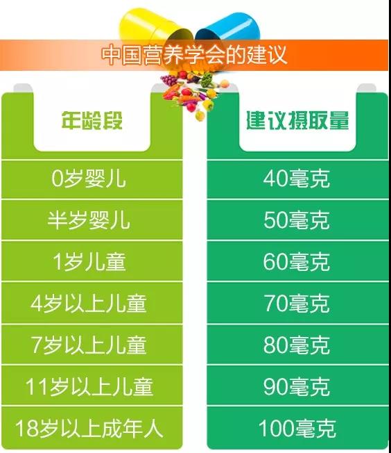 孕妇在孕早期的摄入标准为100毫克,孕中期、孕晚期的标准为130毫克;哺乳期的妇女的摄入量同样为130毫克。