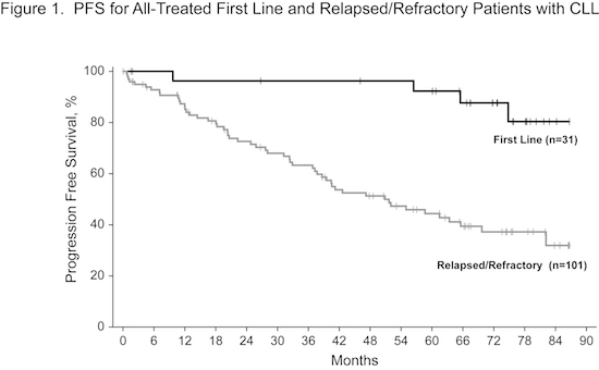 这些数据来自于Ib/II期研究PCYC-1102和扩展研究PCYC-1103的更新汇总数据。这两个研究中共有132例患者,其中31例接受了Imbruvica一线治疗,101例为复发性/难治性(R/R)患者。这些患者中包括具有高风险基因组因素(如复杂核型和未突变的IGHV)的患者,以及超过70例既往已接受3-12种疗法的过度预治疗R/R患者。数据截止时,17例(55%)一线治疗患者和21例(21%)R/R患者继续接受Imbruvica治疗,中位随访时间为67个月(0.7+,87)。