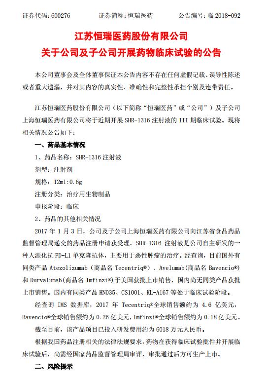 12月5日,恒瑞医药公告称,公司及子公司上海恒瑞医药将于近期开展SHR-1316注射液的 III 期临床试验。