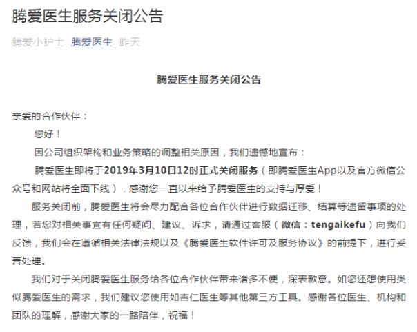 24日,新浪医药从腾爱医生官方微信号了解到,因公司组织架构和业务策略调整,腾爱医生正式宣布关停服务。腾爱医生系腾讯旗下产品,公告提到腾爱医生关停,用户如有类似的需求服务,可以使用杏仁医生等其它第三方工具。