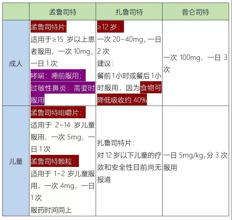 孟鲁司特、扎鲁司特、曲尼司特的区别