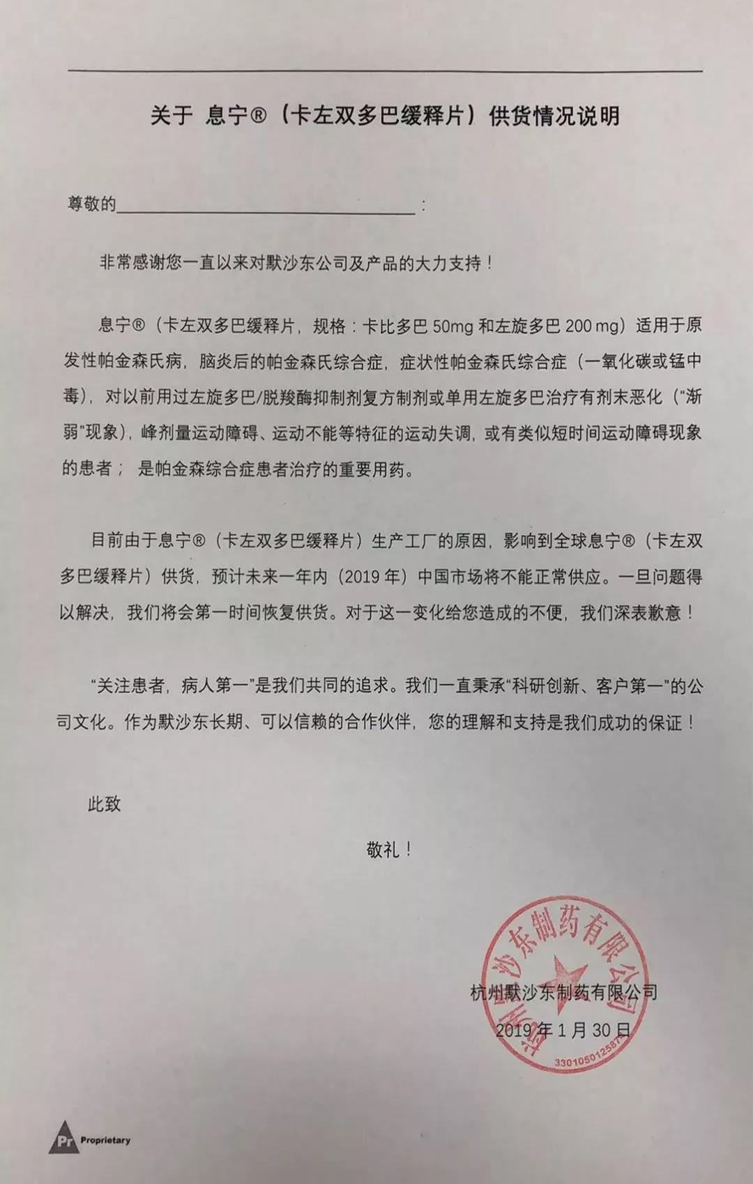 根据帕金森病友会公众号消息,生产厂家默沙东提供的息宁供货说明函显示,本次断货是由于生产工厂的原因,影响全球息宁的供货,预计未来一年内(2019年)中国市场将不能正常供应。目前许多城市处于断药状态,息宁的价格也一路飙升,甚至炒到了600元一盒的高价。