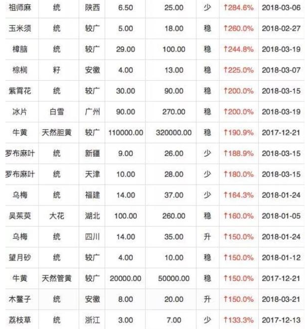 近几年来,中药材价格的飙升大家是有目共睹的。数据显示,在一轮暴涨中,一些中药材品种的价格,仅2017年年底,就已经翻了好几倍。来看一组来自药通网的部分药材价格涨幅数据(近一年):