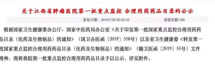 据悉,在江西省肿瘤医院之前,7月江西省卫健委发布了《转发第一批国家重点监控合理用药药品目录(化药及生物制品)的通知》赣卫医函〔201955号。在通知中,江西省公布了2019年第一批重点监控合理用药药品目录,共35个药品在榜。