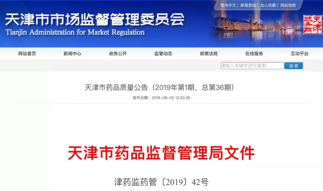 8月2号,天津市市场监督管理委员会发布《天津市药品质量公告(2019年第1期,总第36期)》,公布一批不合格药品名单。