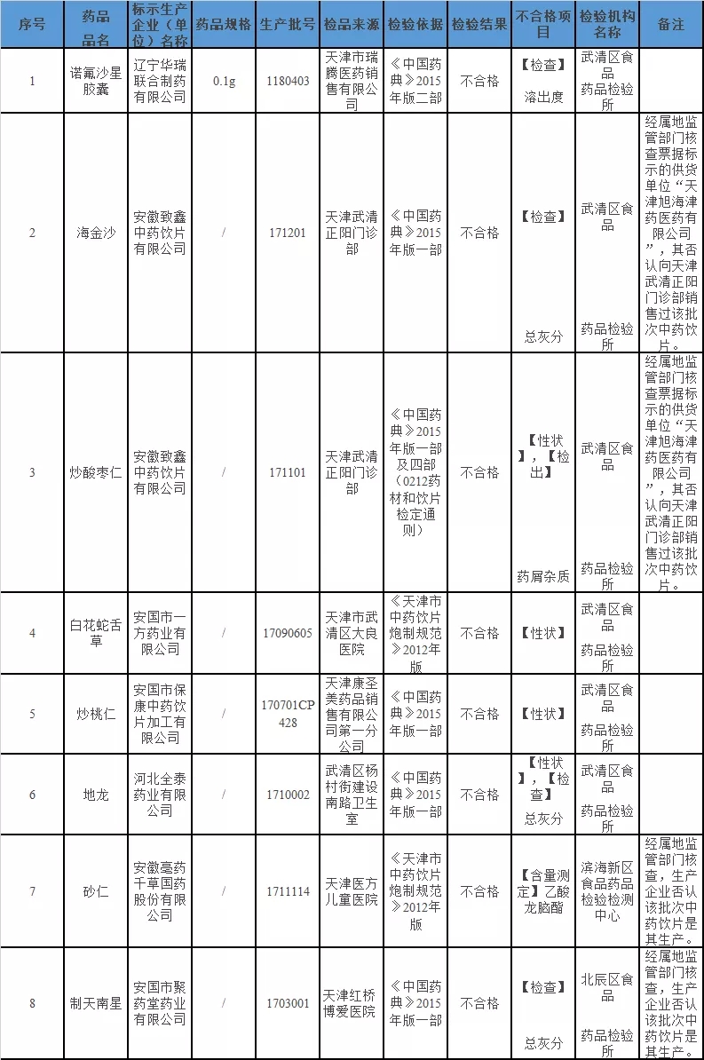据悉,为加强药品监管,保障药品使用安全有效,天津市市监局在近期组织开展了药品监督抽检工作,经检查,在天津市药品生产、经营、使用环节监督抽验中共发现不符合标准规定的药品8批次,分别来自7家药品生产企业。