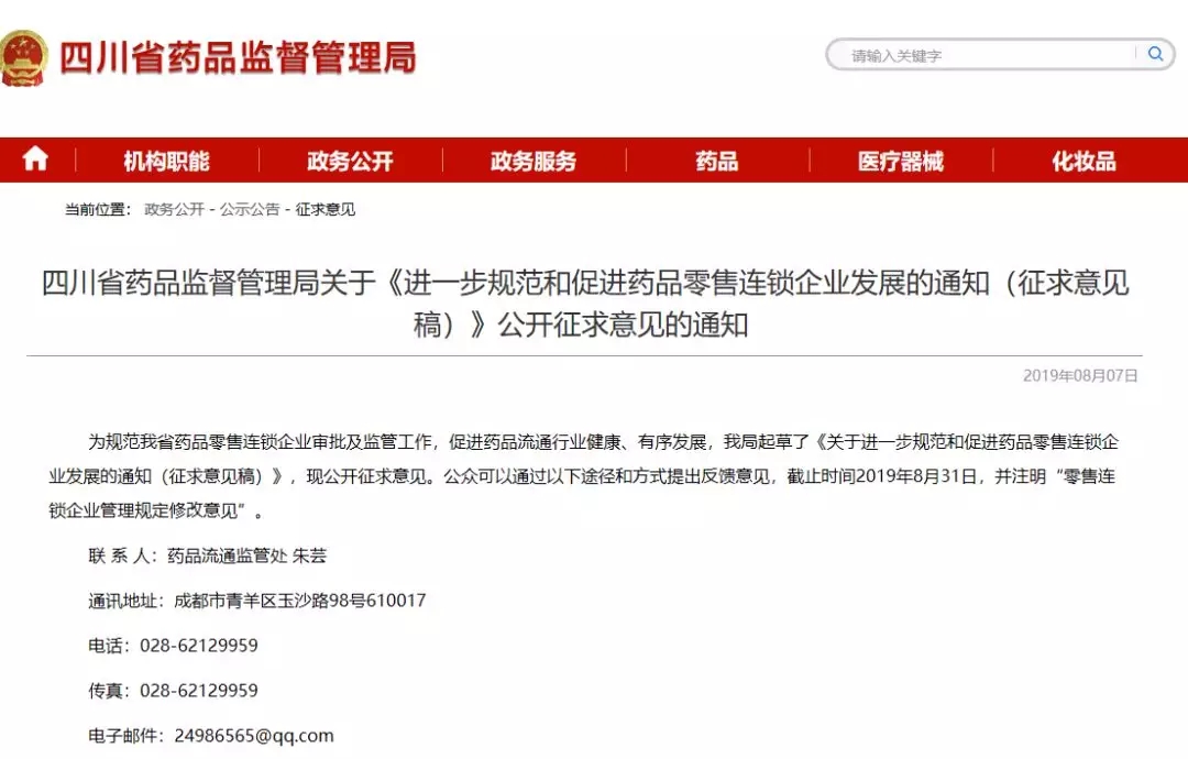 8月7日,四川省药监局发布通知称,为规范我省药品零售连锁企业审批及监管工作,促进药品流通行业健康、有序发展,我局起草了《关于进一步规范和促进药品零售连锁企业发展的通知(征求意见稿)》(以下简称《意见》),现公开征求意见。