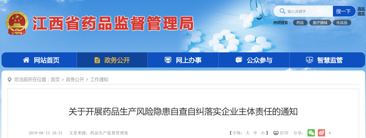 8月13日,江西省药监局发布《关于开展药品生产风险隐患自查自纠落实企业主体责任的通知》。
