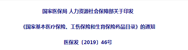 国家医疗保障局、人力资源社会保障部于820日印发《关于印发<国家基本医疗保险、工伤保险和生育保险药品目录>的通知》(医保发〔201946号),正式公布了国家基本医疗保险、工伤保险和生育保险常规准入部分的药品名单,同时明确《药品目录》自202011日起正式实施。