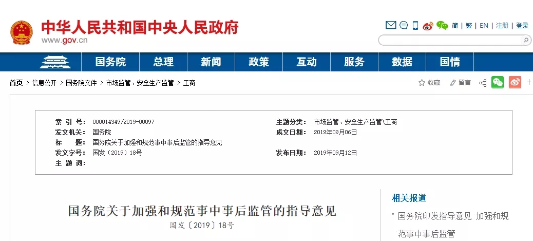 该《意见》导语称,“为深刻转变政府职能,深化简政放权、放管结合、优化服务改革,进一步加强和规范事中事后监管,以公正监管促进公平竞争,加快打造市场化法治化国际化营商环境,提出以下意见。”