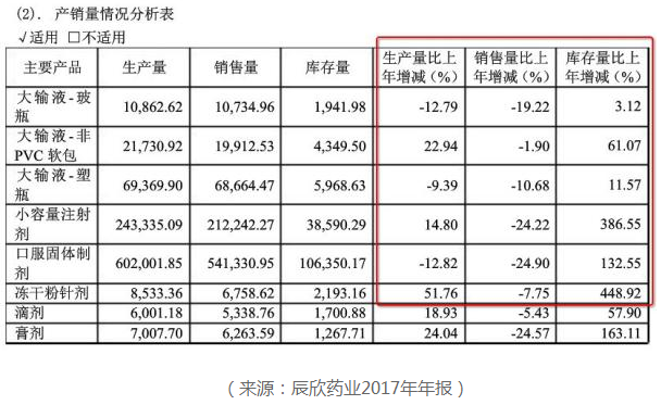 从辰欣药业2017年年报中生产量、销售量、库存量的数据可以看出,在全国范围内限制门诊输液的限抗令开始之后,企业将会对大输液这部分业务进行较大的战略调整。