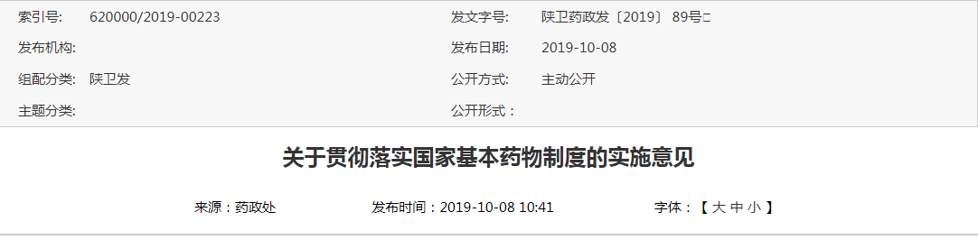 10月8日,陕西省卫健委发布《关于贯彻落实国家基本药物制度的实施意见》(下简称“实施意见”),要求省统一执行《国家基本药物目录》,原“省增补药物”不再按基本药物管理。