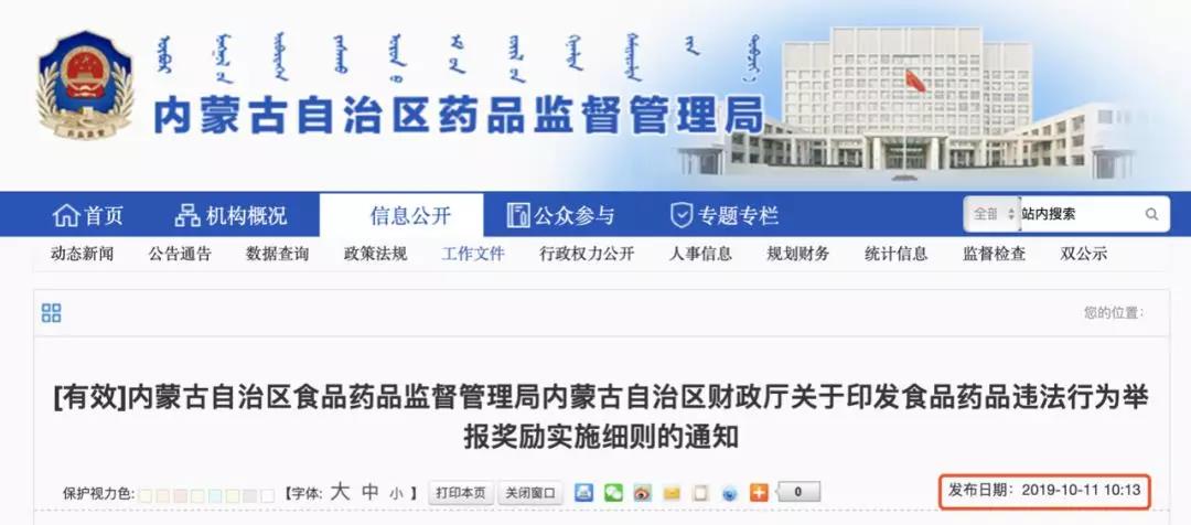 近日,内蒙古药监局发布了《内蒙古自治区食品药品违法行为举报奖励实施细则(试行)》的通知。