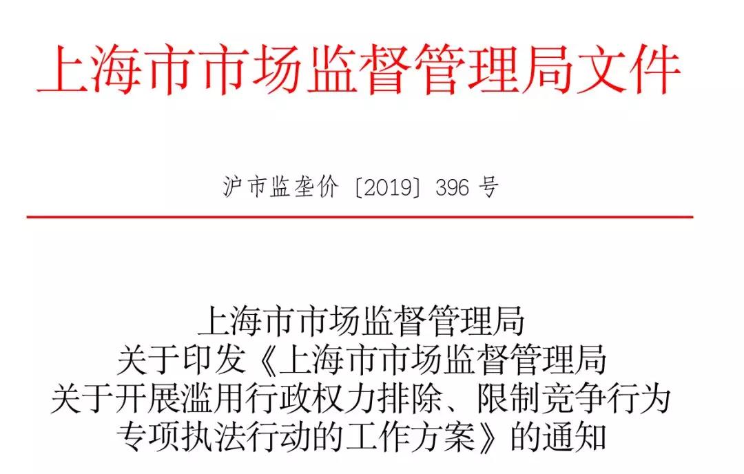 近日,上海市市场监督管理局关于印发《上海市市场监督管理局关于开展滥用行政权力排除、限制竞争行为专项执法行动的工作方案》的通知。