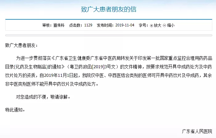 这则致患者信中明确,医院禁止非中医类别医师开具中药饮片及中成药处方。这是广东省对国家政策的又一贯彻和落实。