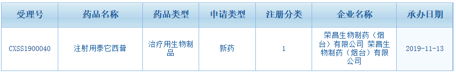 11月13日,CDE官网显示荣昌生物自主研发的系统性红斑狼疮1类新药注射用泰它西普申报上市。