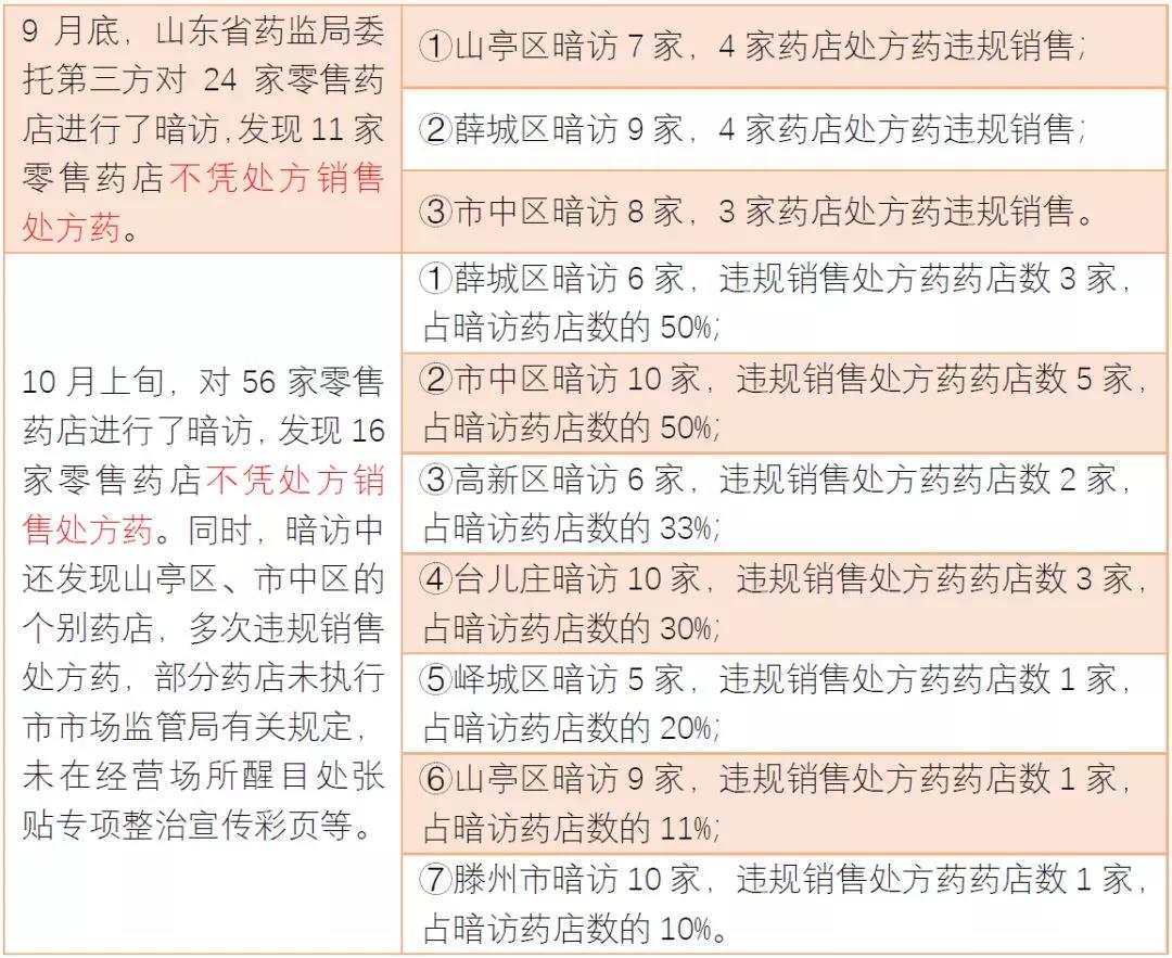 此外,针对暗访中出现的零售药店不凭处方销售处方药等违规行为,枣庄市市场监管局决定收回21家零售药店的药品GSP认证证书,并要求其停业整改;对3家零售药店和涉嫌无证经营的药店,移交当地局依法查处。