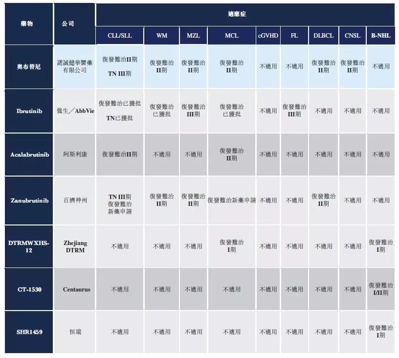 作为全球开发项目中的一部分,目前针对奥布替尼的多项临床研究正在进行中,除上述首个提交NDA的适应症外,亦在中国进行复发/难治套细胞淋巴瘤(MCL)、复发/难治边缘区淋巴瘤(MZL)、复发/难治中枢神经系统淋巴瘤(CNSL)及复发/难治华氏巨球蛋白血症(WM)患者的疗效评价研究;在美国,奥布替尼针对B细胞恶性肿瘤的I期临床试验已于2019年5月获批启动。