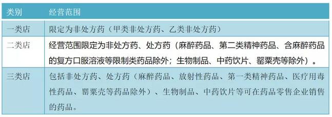 《办法》指出,根据企业设置条件与药品经营范围、经营规模的适应程度,核定的经营范围从小到大分为一类、二类和三类,相对应的企业分别简称为一类店、二类店和三类店。具体如下: