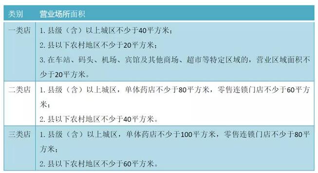 不难发现,二类店、三类店对于单体和连锁要求也不一样,对于二类店,在县级(含)以上城区,单体不少于80平方米,连锁不少于60平方米;至于三类店,单体不少于100平方米,连锁不少于80平方米。