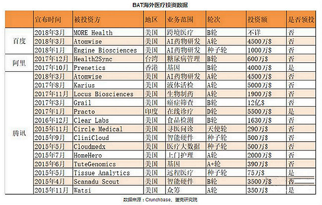 比较有意思的是,百度和腾讯在今年三月共同投资了AI药物研发公司Atomwise,这是他们在海外医疗投资上的唯一交集。