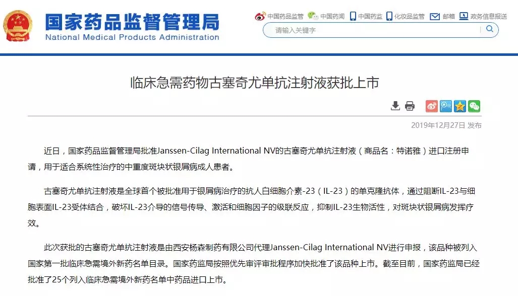12 月 27 日,强生的 Guselkumab 注射液(受理号:JXSS1900035)获国家药监局批准上市,该品种是全球第一个上市的只针对 IL-23 的单抗药物,用于治疗成人中重度斑块状银屑病。