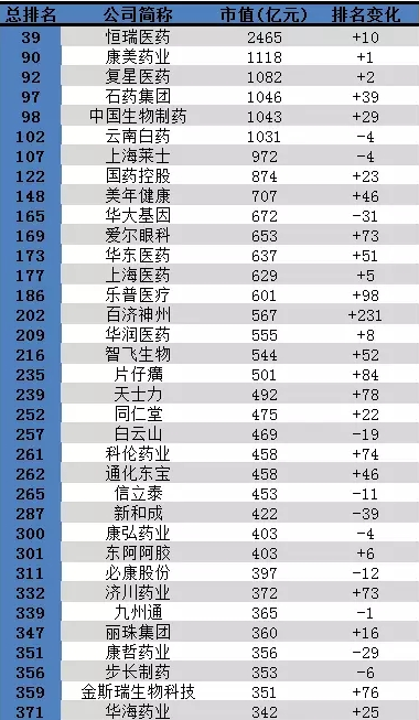 最新“中国上市企业市值500强”榜单近日由wind发布。据了解,此次榜单统计截至2018年一季度末,500强中有42家医药类企业上榜,其中有6家市值超千亿,实力不容小觑。恒瑞医药不负众望,以2465亿元稳居首位,康美药业(1118亿元)、复星医药(1082亿元)、石药集团(1046亿元)、中国生物制药(1043亿元)、云南白药(1031亿元)也成功进入医药千亿俱乐部。
