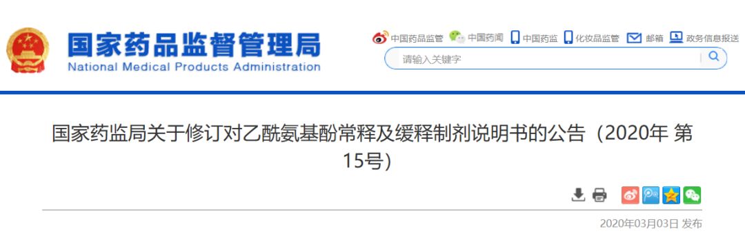 对乙酰氨基酚缓释制剂说明书修订要求统一增加警示语“过量使用对乙酰氨基酚缓释制剂可引起严重肝损伤,长期饮酒、肝功能异常者使用对乙酰氨基酚发生肝损伤的风险更高。”