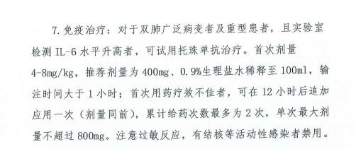 值得关注的是,第七版诊疗方案在重型、危重型病例的治疗中增加了“托珠单抗”用于免疫治疗。适应证为“双肺广泛病变者及重型患者,且实验室检测IL-6水平升高者”。给出了具体用法、用量,要注意过敏反应,有结核等活动性感染者禁用。具体用法如下: