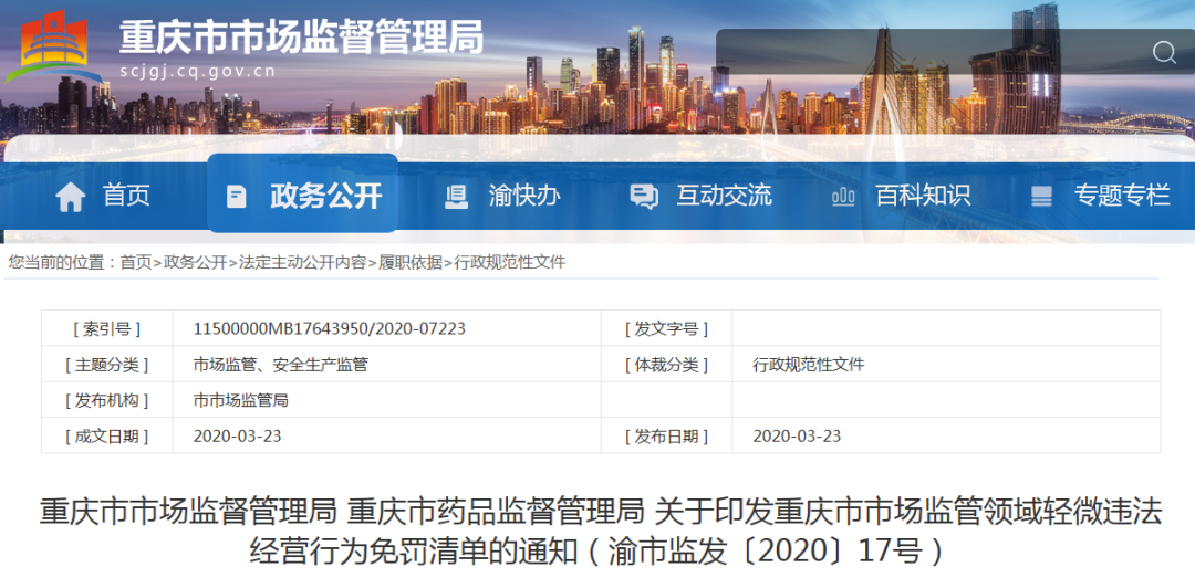 近日,为深入贯彻落实关于支持民营经济发展的决策部署,进一步优化营商环境,推进包容审慎监管,重庆市市场监管局、重庆市药监局印发《重庆市市场监管领域轻微违法经营行为免罚清单》(以下简称《清单》)的通知: