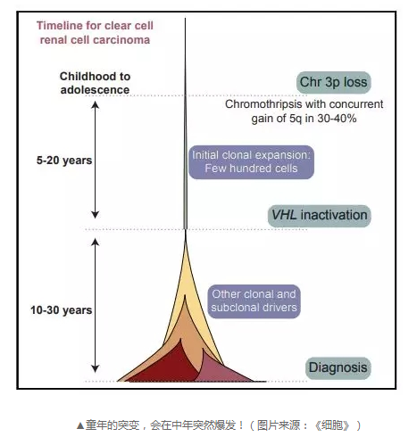 这项研究的通讯作者之一Peter Campbell教授说:“现在我们终于能确定引起肾癌的遗传变异是什么,也知道它们何时会出现。让人惊叹的是,这些标志性的肾癌遗传突变,竟在癌症确诊40、50年前就出现了!癌症的种子在童年或青春期就被种下。知道这些突变的后果以及发作的时间,有望能带来早期干预。”