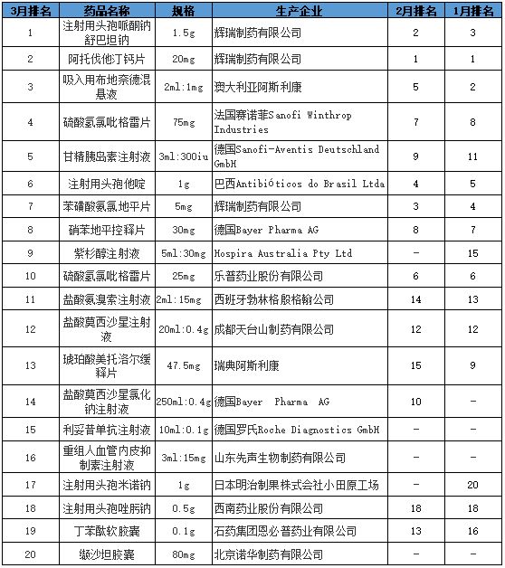 辉瑞的注射用头孢哌酮钠舒巴坦钠舒普深、阿托伐他汀钙片立普妥,赛诺菲的硫酸氢氯吡格雷片的波立维、甘精胰岛素注射液来得时,阿斯利康的吸入用布地奈德混悬液普米克、琥珀酸美托洛尔缓释片倍他乐克是每月前20榜单的常客,月月上榜。具体情况如下表: