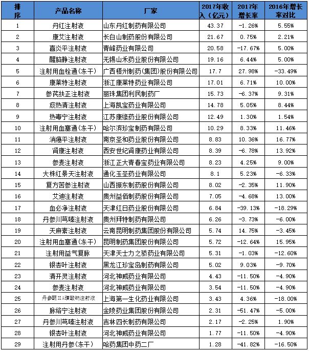 从销售收入来看,虽然所列的29个注射剂大品牌中2016年有超过半数还是增长的,但是疲态尽显,增长在10%及以上的仅有7个,最高的也不超过20%2017年的状况则更为糟糕,所列的29个品牌在2016年的销售收入均在2亿以上,而在2017年有两个品牌销售收入在2亿元以下了,其中仅不到半数的品牌保持了增长。