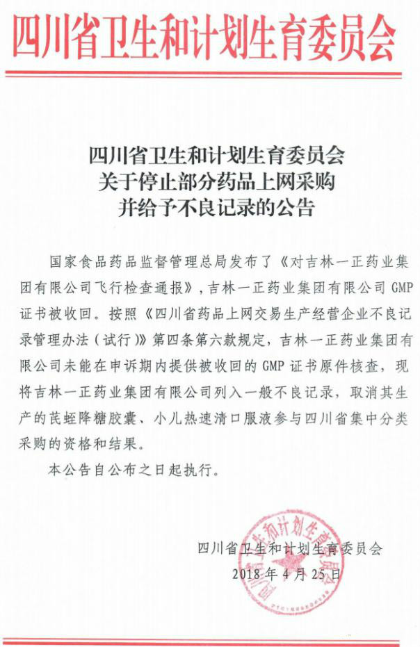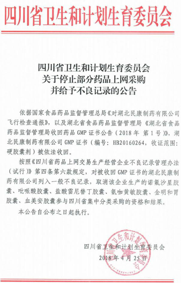 按照《四川省药品上网交易生产经营企业不良记录管理(试行)》第4条第6款规定,对上述被收回GMP证书的2家药企列入一般不良记录,同时取消湖北民康制药有限公司生产的诺氟沙星胶囊等6个药品;吉林一正药业集团有限公司生产的芪蛭降糖胶囊等2个药品参与四川省集中分类采购的资格和结果。具体公告如下: