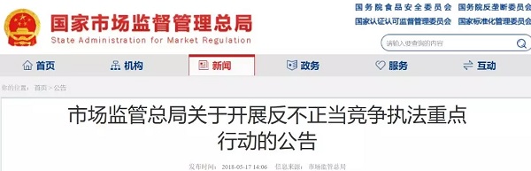 国家市场监督管理总局于5月17日发布《关于开展反不正当竞争执法重点行动的公告〔2018年第4号〕》。此次反不正当竞争行动时间从5月开始,持续到10月。公告中,列出了本次行动重点打击问题,旨在切实加强社会监督和共治,维护市场公平竞争的秩序。