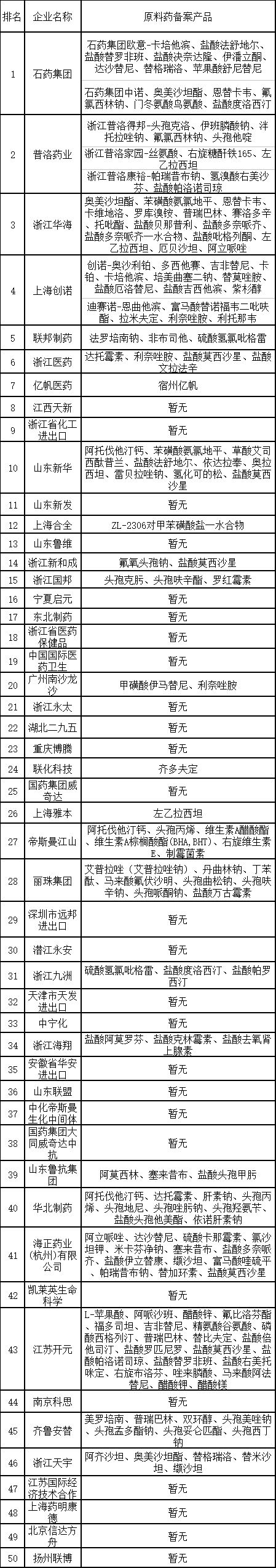 举个例子,出口五十强企业使用DMF体系后,近半数是无备案产品。根据中国医保商会2017年原料药出口企业五十强数据,石药集团、普洛药业、华海药业、创诺医药、联邦制药、浙江医药、亿帆医药、江西天新、浙江化工、新华制药十家国内原料药龙头企业位居我国原料药出口企业榜单前十强,累计出口额24.02亿美元,占比8.25%;出口额过亿美元的企业已达32家,超五千万美元的已达107家,累计占比分别达18.89%36.68%