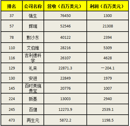 即使经济呈现出了不确定性,但是制药企业展示出了比其他企业更好的稳定性。公认的制药行业健康状况风向标——纳斯达克生物技术指数,在去年上涨超过21%,这一趋势也在今年的财富榜单中得到印证,上表中的11家公司中,只有再生元是今年新上榜企业,其余10家在去年就和大家见过面。除此之外,大多数公司与去年的排名相差不大,例如制药行业前三甲强生、辉瑞及默沙东的排名变化都在10名以内。个别的如新基提升幅度较大,上升30名;吉利德科学稍显退后,下降24名。